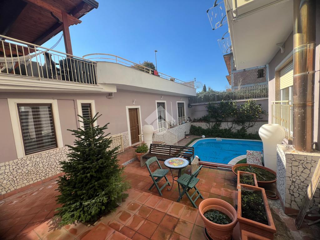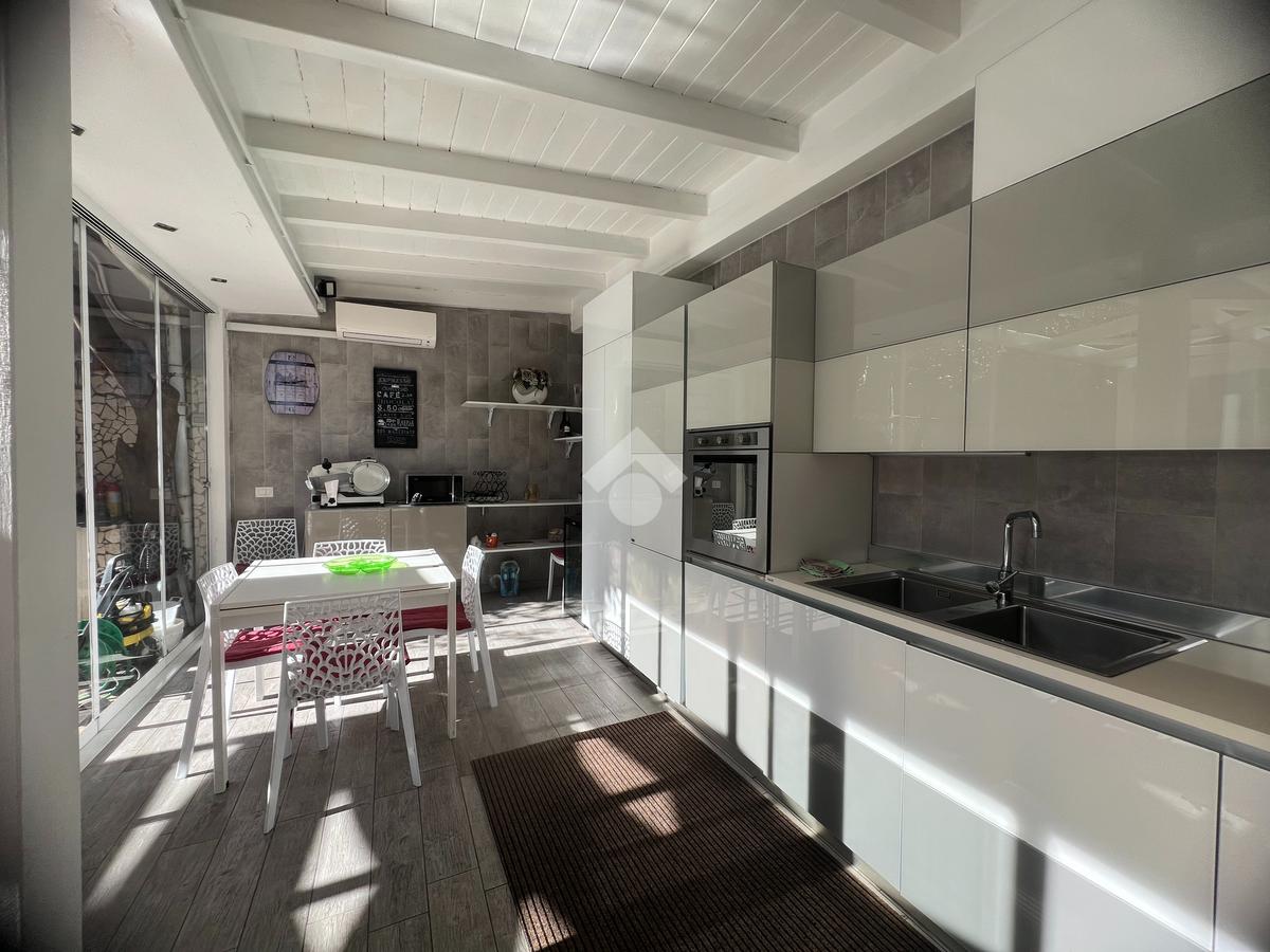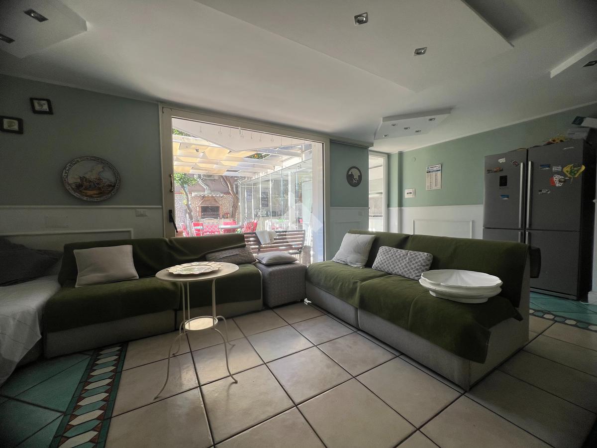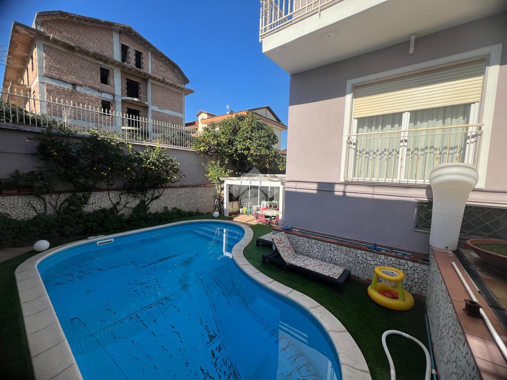 Al piano terra, esternamente, si trova una cucina completamente vetrata, luminosa e moderna, con affaccio diretto sulla piscina situata nel giardino, creando una continuità armoniosa tra interno ed esterno.